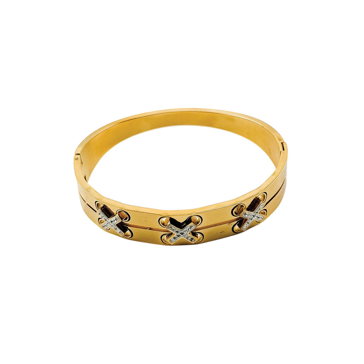 This modern bangle is made from high-quality titanium steel, offering lasting durability and a polished finish. Plated in real gold with a premium PVD coating, it’s available in both gold and silver tones. The design is accented with rhinestones and pearls, adding a refined, IG-inspired touch. At 19g, it’s a sleek statement piece built for daily wear.